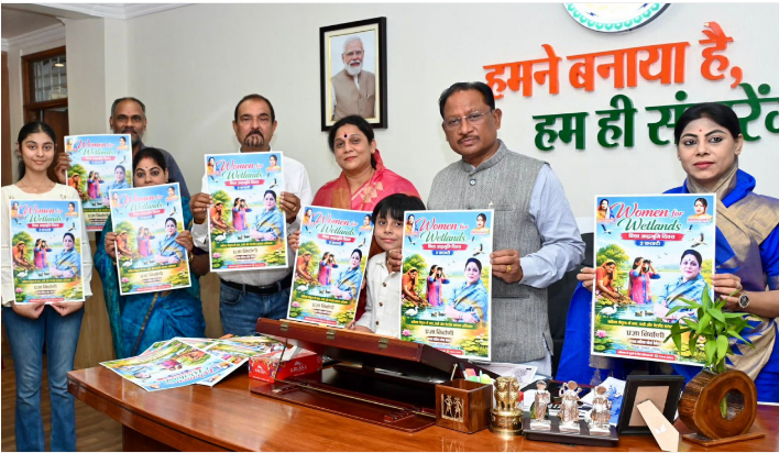 Raipur (thestates.news) | Chief Minister Shri Vishnu Deo Sai recently released the poster of the ‘Women for Wetlands’ campaign at his residence on the occasion of World Wetlands Day. Appreciating the initiative aimed at protecting wetlands and natural water sources in the State, Chief Minister said that water is life and wetlands are an invaluable heritage of human civilisation. He described the involvement of women in this mission as an inspiring step towards environmental conservation.
